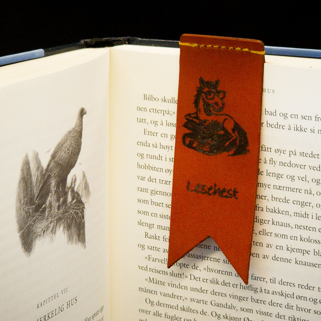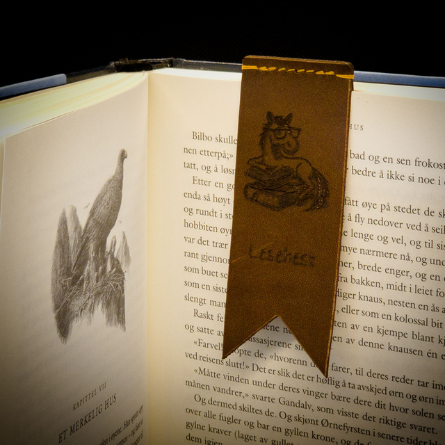 Tradisjonelt håndverk kombinert med moderne teknologi. Dette bokmerket er håndsydd i ekte lær og lasergravert med en detaljert illustrasjon av en hest på en stabel bøker, sammen med teksten "Lesehest". Perfekt for den som alltid har en bok for hånden.